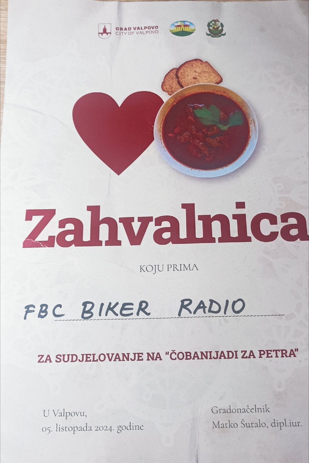 5. istopada 2024. godine u organizaciji Lovačkog društva “Šljuka” Valpovo, Turističke zajednice Grada Valpova, Grada Valpova te uz potporu brojnih sponzora, organizirana je humanitarna „ČOBANIJADA ZA PETRA“. FBC “Biker radio” sudjelovao je u ovoj akciji učešćem u kuhanju čobanca u ekipi prijateljskog Moto kluba “Dva Grada” (Belišće/Valpovo).